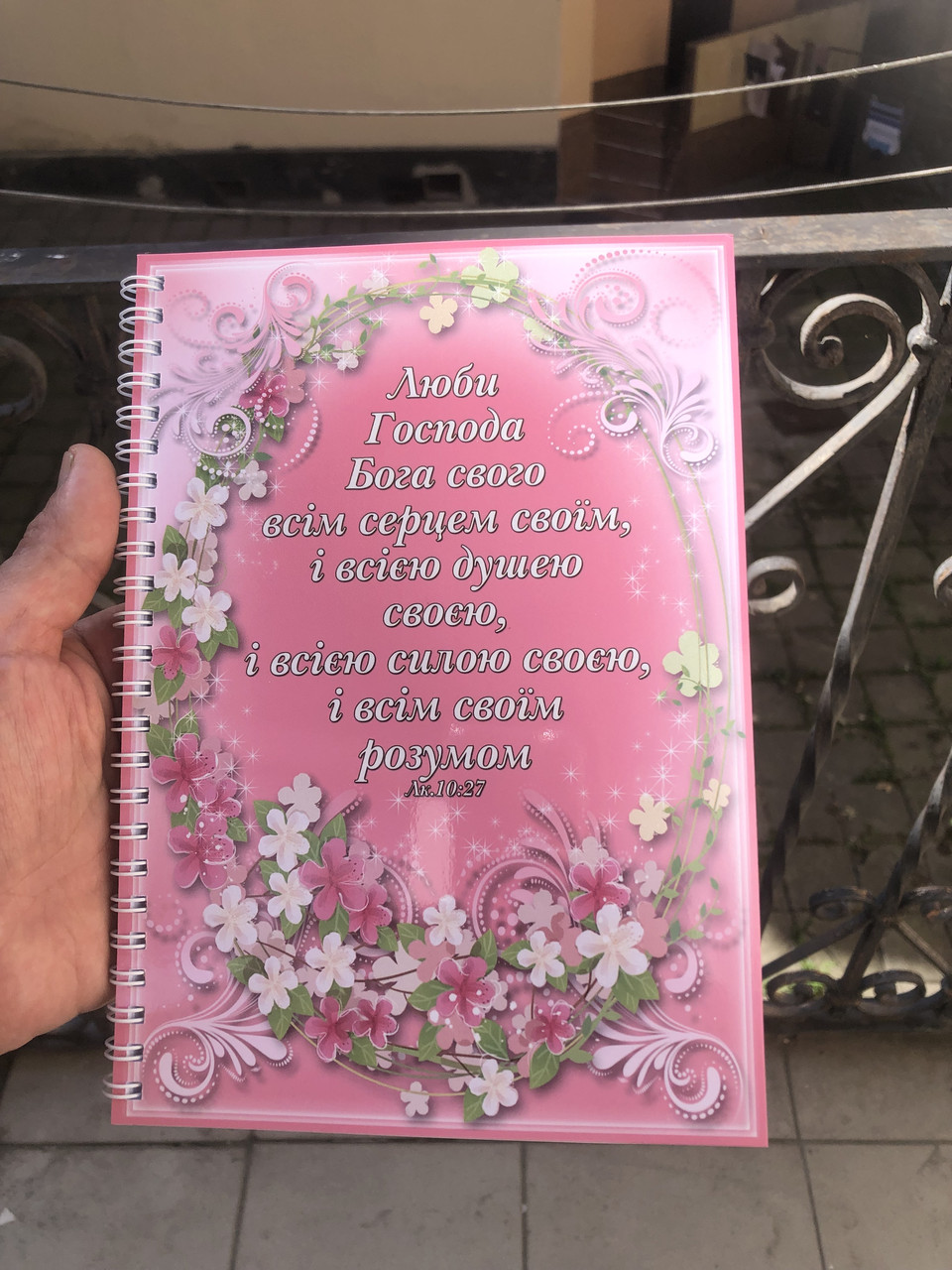 Яскравий блокнот на пружині з цитатами із Святого Письма. Ви зможете записувати в нього всю необхідну інформацію, плани на кожен день, цінні думки, молитви і молитовні потреби, а також кулінарні рецепти і багато, багато іншого . Чудовий подарунок для ваших друзів і близьких!